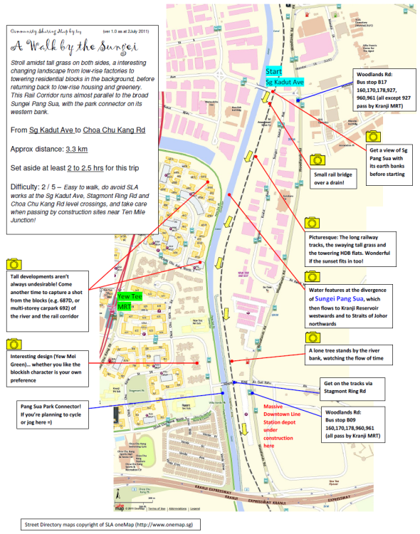 Here’s a map of A Walk by the Sungei – Walking route from Sungei Kadut Avenue to Choa Chu Kang Road, which includes good photo-taking spots. Thanks to the great effort from CY Leong!